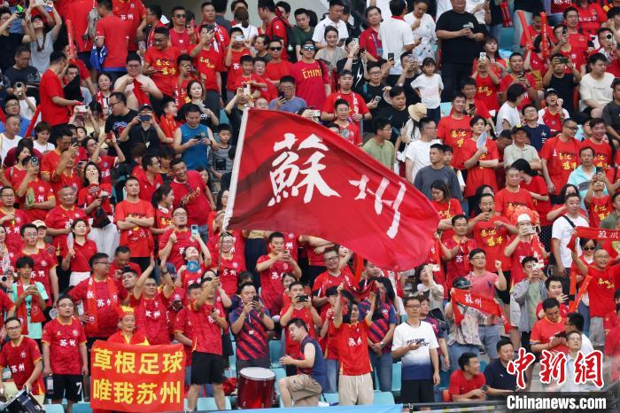 中新网苏州6月30日电(记者 钟升)29日晚,苏州昆山奥体中心足球场内人声鼎沸,江苏省城市足球联赛(又名“苏超”)第五轮苏州队主场对战扬州队的比赛正火热进行。随着苏州队的一粒进球,场上比分变更为3:0。在“苏台一家亲 苏州就是行”的旗帜下,一群在昆山工作、生活的台胞高声欢呼,与大陆朋友一道分享着喜悦。