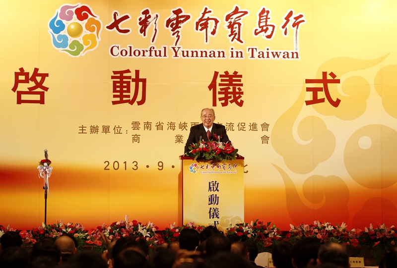 2013年9月18日,“七彩云南宝岛行”启动仪式在台北圆山饭店举行,图为中国国民党荣誉主席吴伯雄出席启动仪式并致辞。